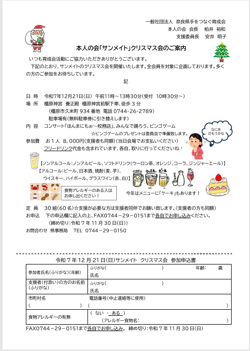 令和7年12月21日(日)午前11時~午後1時30分まで、本人の会「サンメイト」クリスマス会を開催します。